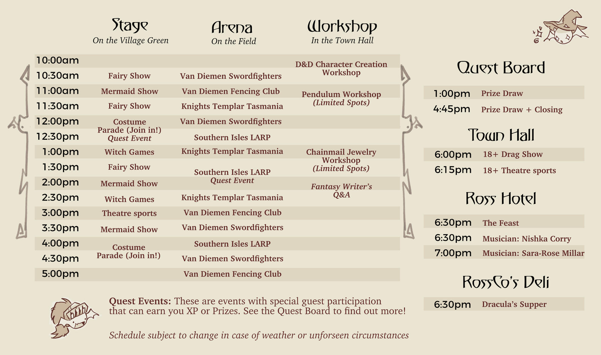 Please check the Timetable page to see when and where Events are scheduledMuch of TasFaire will be public entry, meaning that you can engage with the festivities completely free of charge! There will be some limited events and spaces like the marketplace, however, that will require a ticket to enter.The marketplace at TasFaire will boast a collection of vendors selling fantasy themed goods and items from creatives and businesses around Tasmania. Whether searching for merch of your favourite fantasy characters, new dice for your d&d campaign, or fantasy and medieval themed trinkets, the marketplace will be the perfect place to find your newest treasure.We will also have vendors and demonstrators outside throughout the day for you to explore and interact with, as well as performances from entertainers all around Tasmania.There will also be limited Dungeons and Dragons games hosted throughout the day in scheduled slots, meaning that you can enter into a brand new quest and experience one of the most popular TTRPGs in the world. These games will be run by experienced, professional DMs, and will cater to beginners and experienced players alike. Positions are strictly limited, and will be a paid experience.There will also be LARP, a Scavenger hunt themed Quest Board, fighting demonstrations, and more! So make sure that you come along to join in the fun.